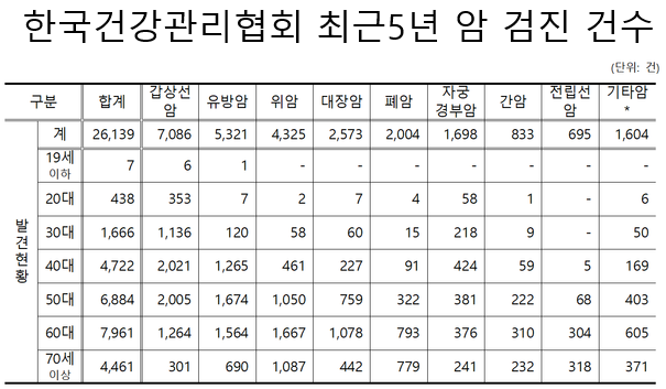 연도별로는 2017년 4641건, 2018년 4619건, 2019년 5651건, 2020년 5245건, 2021년 5983건이다. 갑상선암이 가장 많이 발견됐고, 이어서 유방암, 위암, 대장암, 폐암, 자궁경부암, 간암, 전립선암 순이었다. 혈액암 등 총 50종의 저빈도 발견암으로 분류된 기타암은 1604건이었다. 기타암은 난소암과 뇌암, 담관암 등 총 50종이다.