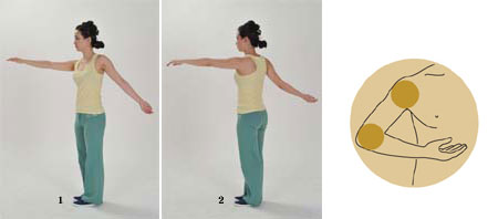 편안히 두 발을 모으고 서서 마음은 단전에 두고 호흡을 천천히 하면서 두 팔을 돌린다. 힘을 주거나 관절을 구부리는 등 억지가 없이 자연스럽게 동작을 이어간다.