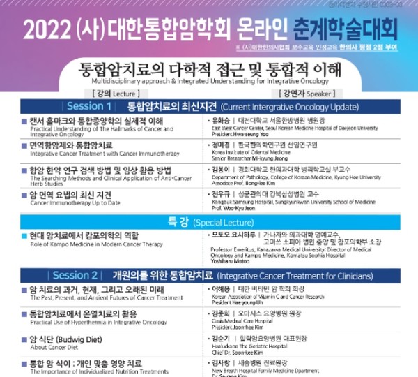 일본 가나자와 의과대학의 모토오 요시하루 명예교수(고마쓰소피아병원 조양 및 캄포의학부 소장)이 ‘현대 암치료에서 캄포의학의 역할’을 주제로 특별강연을 진행한다. 강의 시간은 한 강좌당 25분 내외, 특강은 60분 내외로 진행된다. 대한통합암학회 온라인 춘계학술대회 강의, 발표는 하베스트 홈페이지(www.havest.kr)를 통해 신청해 들을 수 있다. 참가비는 정회원 3만원, 비회원 5만원이다.