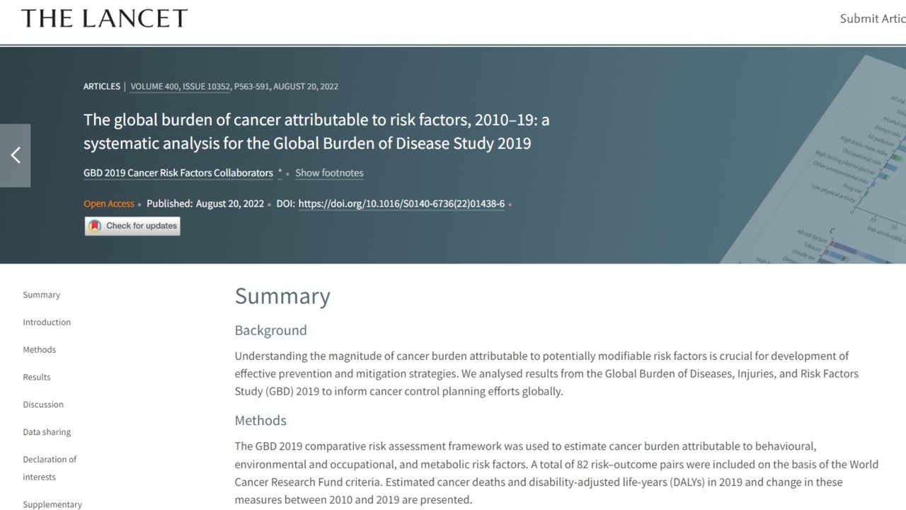 연구진은 2019년 전 세계적으로 사망률 측면에서 가장 위험성이 높은 암은 남녀 통틀어 기관지와 폐 관련 암이라고 밝혔다. 또 2010년부터 2019년까지 예방 가능한 위험인자로 인한 암 사망자가 20.4%나 증가했다고 지적했다. 2019년 이러한 위험인자로 인한 암 사망률의 상위 5개 지역은 중부유럽, 동아시아, 북미, 중남미, 서유럽이었다.
