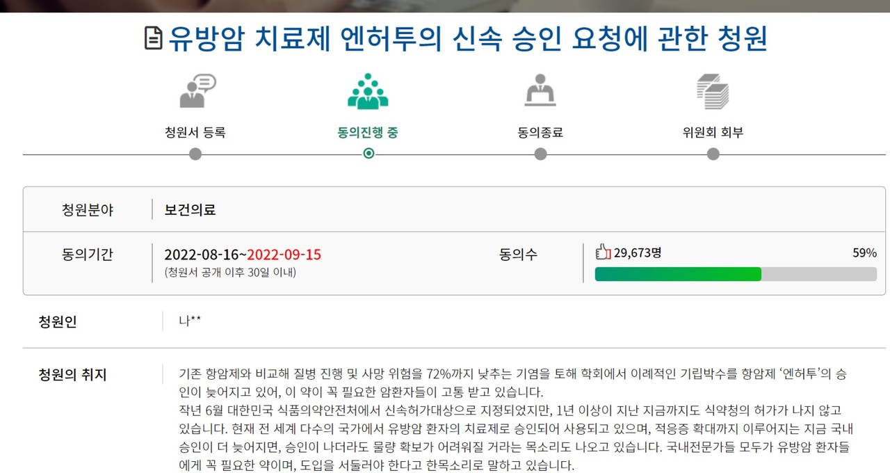 유방암 치료 신약인 '엔허투(트라스트주맙, 데룩스테칸)'를 빨리 국내에 들여와야 한다는 내용의 국회 국민동의 청원에 유방암 환우의 반응이 뜨겁다.
