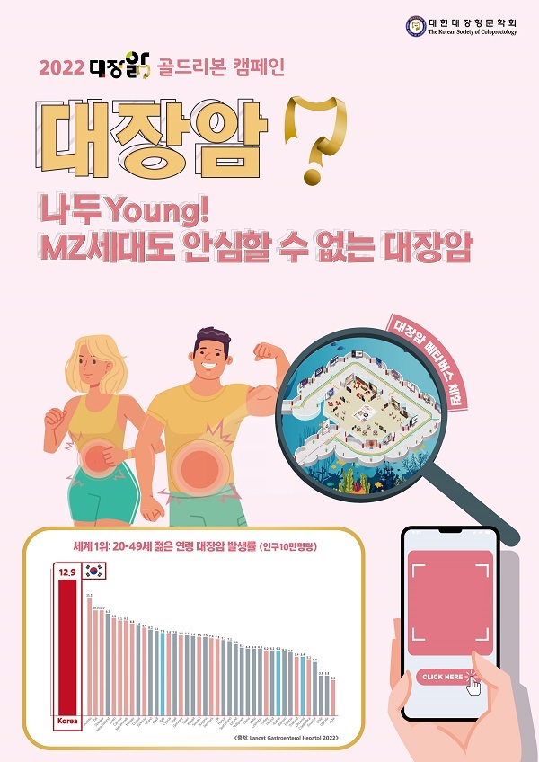 대한대장항문학회는 2~4일 대한대장항문학회국제학술대회 'International Colorectal Research Summit 2022(ICRS 2022)'에서 ‘대장앎 골드리본 캠페인’ 발표를 실시하며, 대장암과 관련된 상황들을 대한대장항문학회 회원 및 병원에게 알리고, 대국민 홍보 활동으로 국민에게 발표할 예정이다.