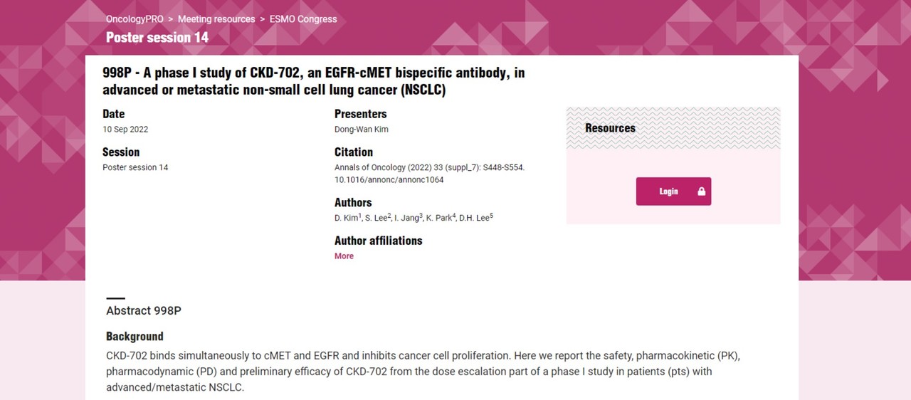 현재 임상1상의 Part1을 종료하고 Part2를 진행 중이며 이번 발표된 데이터에는 Part1에 등록된 24명에 대한 예비분석 결과를 담았다. 임상1상 결과 CKD-702의 모든 투여군에서 용량제한독성(DLT)은 관찰되지 않았다. 임상에서 확인된 발진, 손발톱주위염, 구내염, 오심, 저알부민혈증 및 주입관련반응 등은 대부분 EGFR 및 cMET 억제제에서 나타나는 이상반응이었다.
