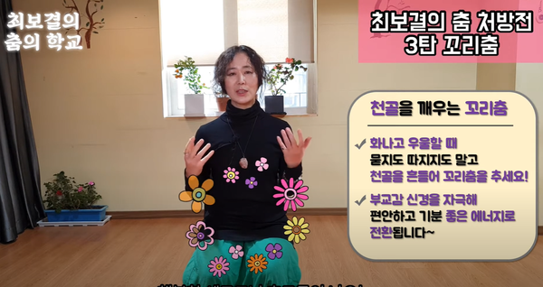 다시 말하면 꼬리뼈만 살살 흔들어 주면 그 파동이 부교감신경을 활성화하여 척추와 신체부위로 쉽게 흘러가도록 하는 가성비 높은 기능성 춤입니다. 건강해지고 기분 좋아지는 반가운 춤입니다.