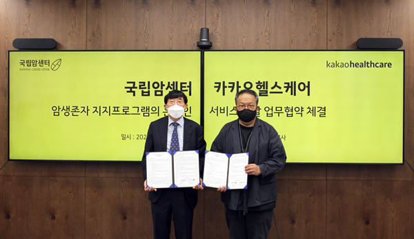 국립암센터와 카카오헬스케어가 20일 ‘암생존자 통합지지프로그램’의 온라인(모바일) 서비스 개발 협력체계 구축을 위해 상호협력 업무협약을 체결했다.