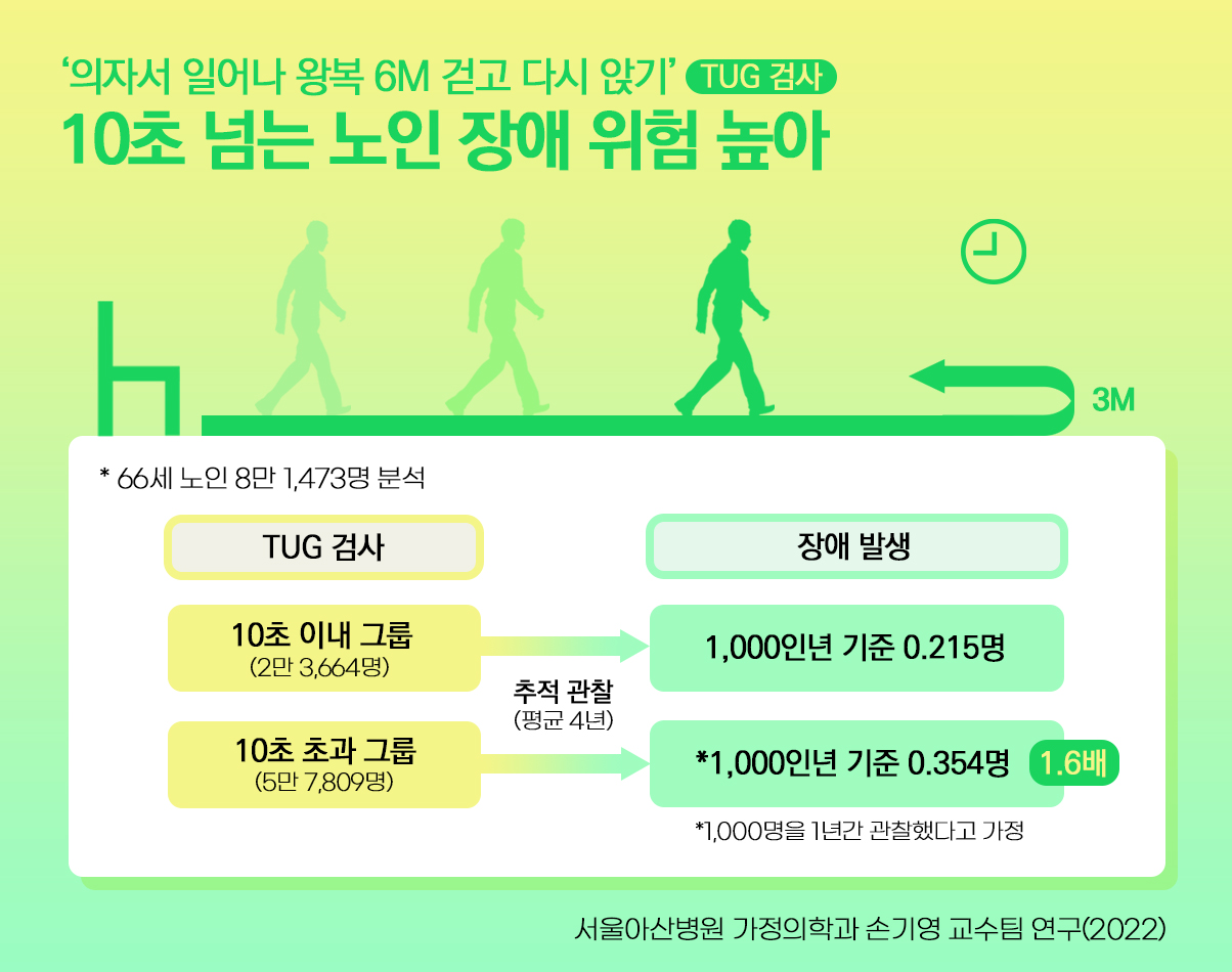 연구팀은 국민건강보험공단의 건강검진 코호트 자료(2002~2015년)를 바탕으로 66세 노인 8만1473명의 '일어서서 걷기(TUG, Timed Up and Go)' 검사 결과와 이후 국가장애등록 여부를 평균 4.1년(최대 8.9년)간 분석했다.