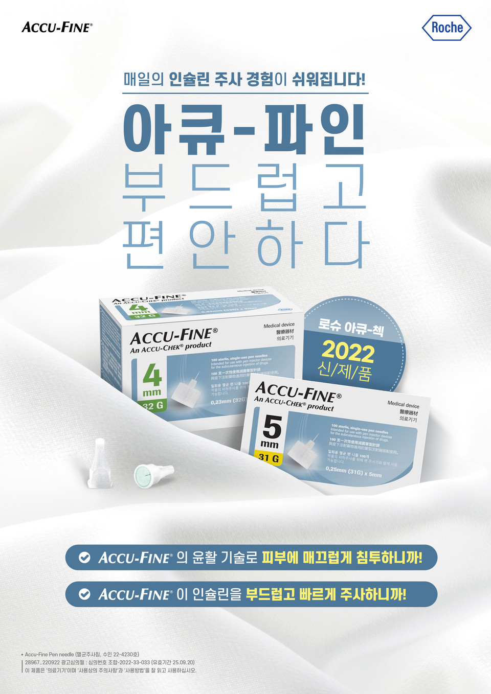 이번에 출시한 한국로슈진단의 아큐-파인 펜 니들은 바늘에 윤활 기술을 적용해 인슐린을 피하지방층에 안정적이고 부드럽게 주사하도록 돕는 등 당뇨병 환자가 질환을 더욱 효과적으로 관리할 수 있도록 디자인됐다.