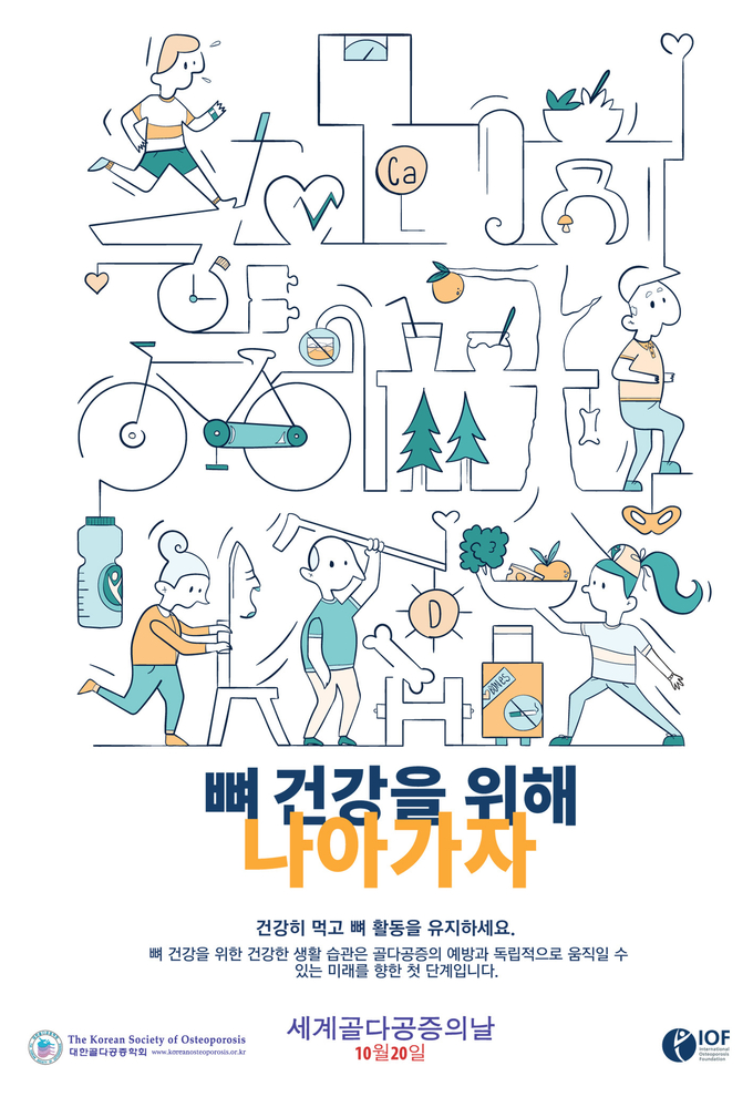 1996년 시작된 ’세계 골다공증의 날‘ 행사는 매년 행사 주제를 선정해 발표한다. 올해 주제는 'Step Up for Bone Health(뼈 건강을 위해 나아가자)‘로 정해졌다. 대한골다공증학회는 세계골다공증재단의 국제 포스터 한국어 버전 제작에 참여했고, 회원들 병원에 배포해 골다공증 예방과 진단, 치료의 중요성을 알리고 있다.