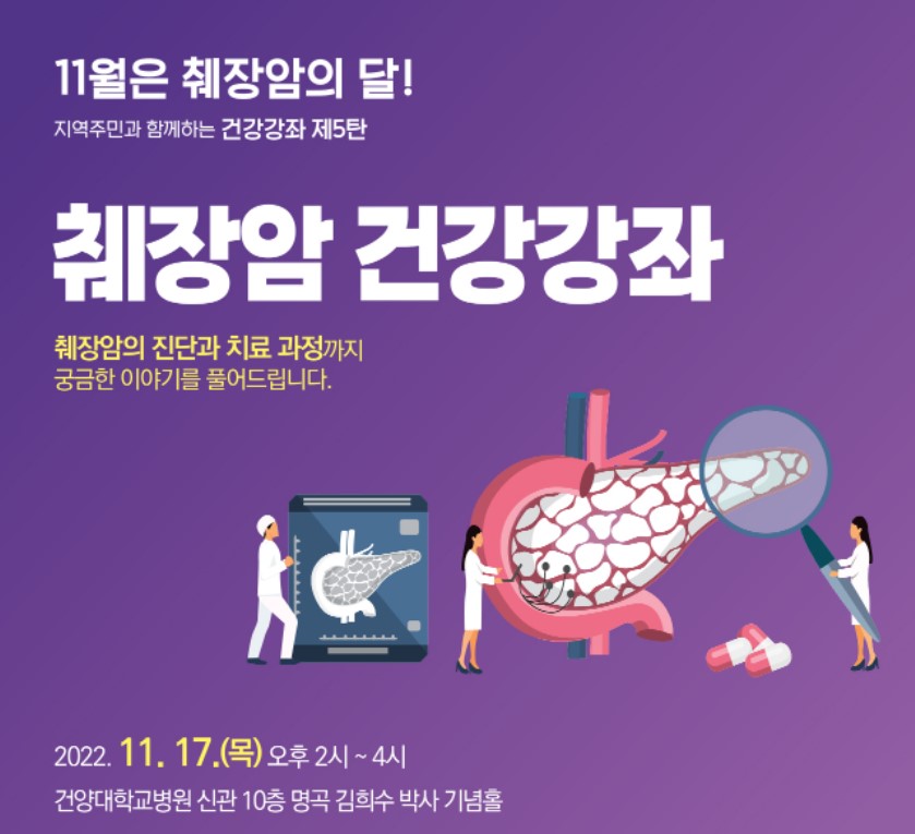 '췌장암의 달' 11월을 맞아 건양대병원은 "오는 17일 김희수 박사 기념 홀에서 췌장암 다학제 진료팀이 질환에 대한 올바른 정보를 제공하기 위해 ‘췌장암’ 건강강좌를 개최한다"고 1일 밝혔다.