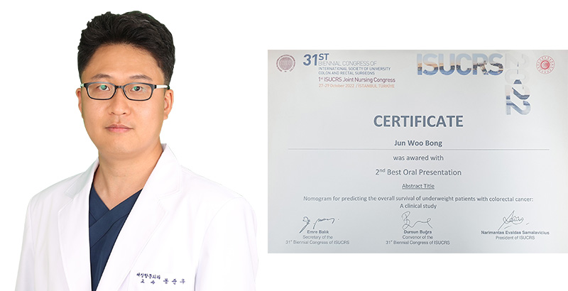 대장항문외과 봉준우 교수는 ‘저체중 대장암 환자의 생존예측을 위한 노모그램’을 주제로 상을 받았다.
