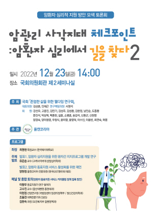 패널 및 종합 토의에는 이향우 동료지원가 연구 참여자, 고수진 교수(울산대병원 종양내과), 이현정 선임연구원(국립암센터 암관리정책부/정신건강의학과), 김한숙 과장(보건복지부 질병정책과) 등이 참여한다.