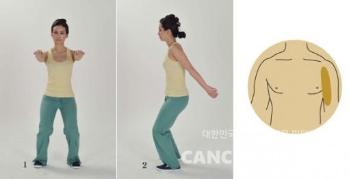 ① 두 발을 어깨너비로 벌려 11자로 딛고 무릎을 약간 굽혀 앉는다. 두 팔은 손등이 위를 향하게 하여 어깨높이로 들어올린다.
