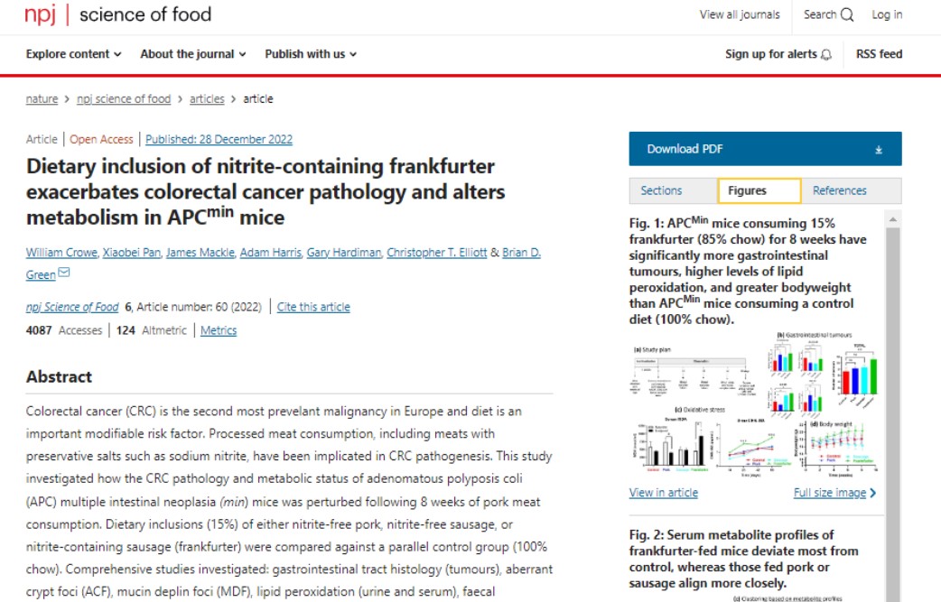 영국 일간지 가디언에 따르면, 영국 북아일랜드 벨파스트의 퀸즈대학교 연구팀은 아질산염이 함유된 가공육을 먹인 쥐들이 아질산염이 없는 가공육을 먹은 쥐들보다 암에 걸릴 확률이 75% 더 높다는 연구 결과를 국제학술지 ‘네이처(Nature)’에 최근 발표했다.