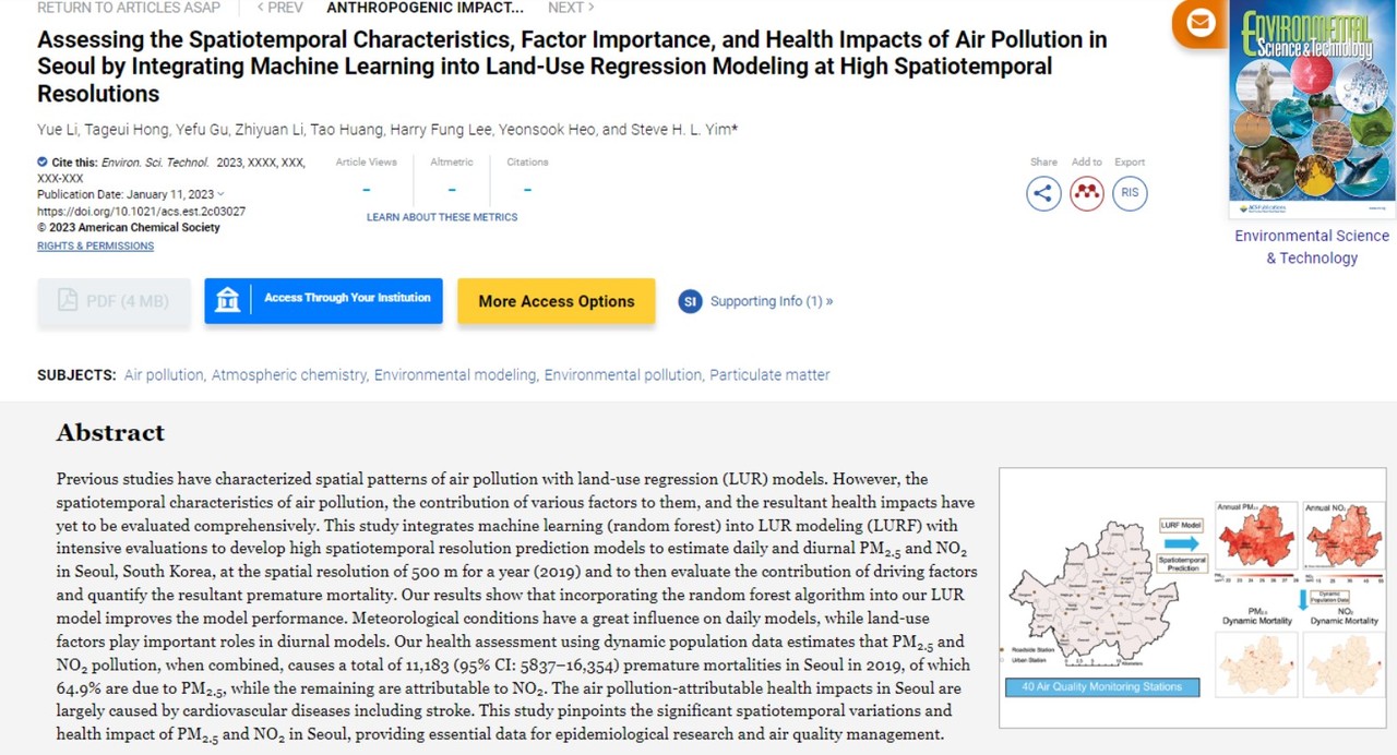 홍콩 중문대학의 해리 리 교수, 싱가포르 난양 공과대학 스티브 임 교수와 고려대 건축사회환경공학부 허연숙 교수 연구팀은 2019년 서울의 대기오염도와 기상자료, 인구분포, 인구이동(교통정보), 토지이용 형태 등의 자료를 활용, 기계학습(랜덤 포레스트) 방식의 고(高)해상도 시공간 오염(LURF) 모델링을 수행해 이 같은 결과를 얻었다. 이 연구 결과는 국제학술지 '환경 과학과 기술(Environmental Science & Technology)'에 최근 발표됐다.