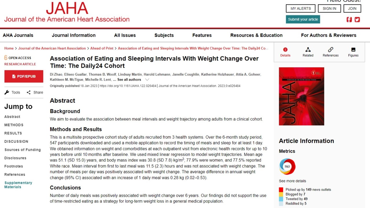 연구팀은 6년에 걸쳐 547명의 식사 시간과 식사량 그리고 건강과 체중을 추적했다. 그 결과 하루에 식사를 하는 간격과 체중 사이에 아무런 연관성이 없는 것으로 나타났다. 간헐적 단식처럼 식사시간 제한을 통해 살을 빼려는 시도는 최근 각광받는 다이어트법이 큰 효용이 없다는 연구결과다.