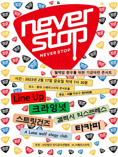 인디뮤지션들의 새로운 공연 브랜드 ‘NEVER STOP’이 혈액암 환우를 위한 기금마련 공연 ‘NEVER STOP_Vol.1’ 개최를 시작으로 본격적인 활동에 돌입한다.