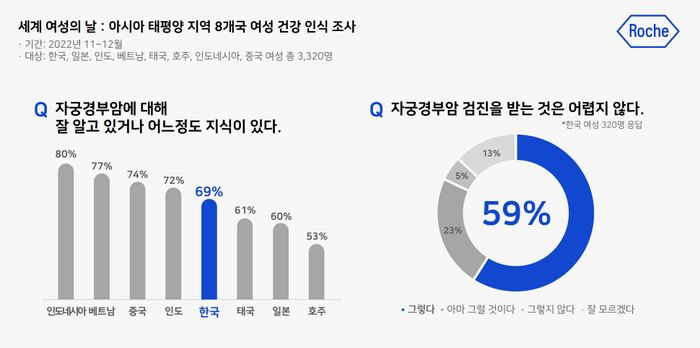 조사 결과에 따르면 대표적인 여성 질환 중 하나인 자궁경부암에 대한 인식 조사에서 우리나라 여성 10명중 7명(69%)은 잘 알고 있거나 어느 정도 지식이 있다고 응답했다. 다만 다른 국가와 비교했을 때 8개국 중 5위를 기록해 상대적으로 자궁경부암에 대한 이해도가 낮은 편으로 나타났다. 적절한 시기에 어렵지 않게 자궁경부암 검사를 받을 수 있는지에 대한 질문에는 59%가 그렇다고 답변했고 13%는 잘 모르겠다고 응답했다.