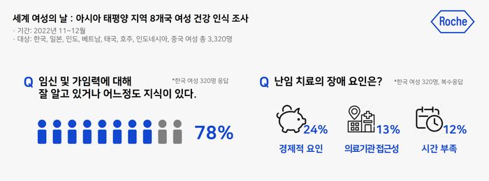 임신 및 난임 치료 인식 분야에서는 78%가 잘 알고 있거나 어느 정도 지식이 있다고 응답했다. 임신 가능성을 높이기 위해 활용할 수 있는 방안이 얼마나 있는지에 대한 질문에는 10명 중 1명(10%)만이 많은 편이라고 응답했다. 이는 8개국 중 가장 낮은 수치로 7위인 일본(32%)과도 큰 격차를 보였다.