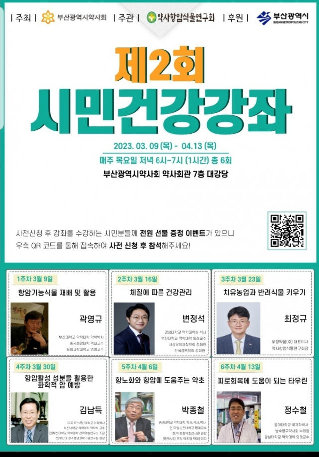 부산시약사회(회장 변정석)와 약사항암식물연구회(회장 최정규)는 3월 9일부터 4월 13일까지 매주 목요일 저녁 동구 초량동 부산시약사회 회관 7층 대강당에서 ‘제2회 시민건강강좌’를 연다.