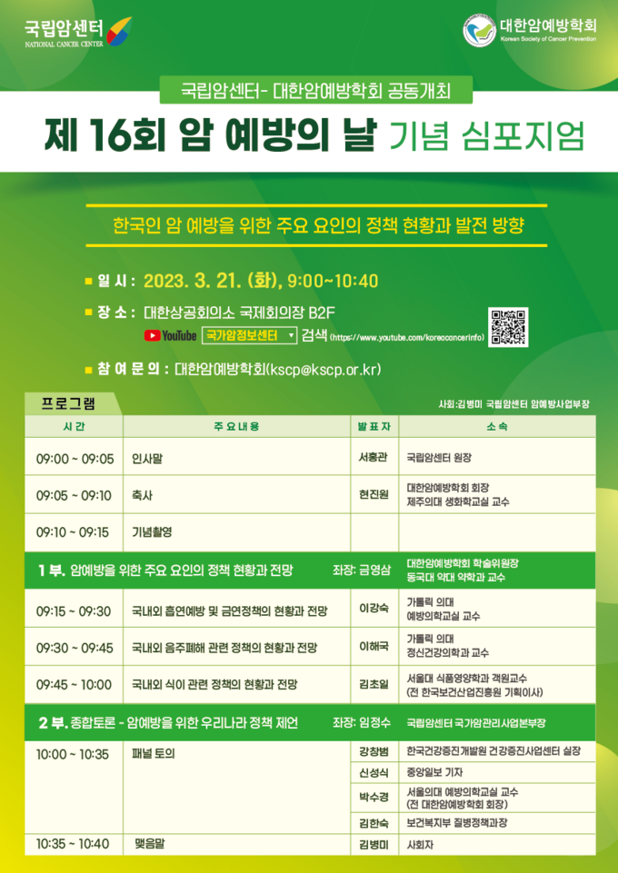 3월 21일은 '암 예방의 날'. 국립암센터(원장 서홍관)와 대한암예방학회(회장 현진원)는 이날 대한상공회의소 국제회의장에서 ‘한국인 암 예방을 위한 주요 요인의 정책 현황과 발전 발향’이라는 주제로 암 예방의 날 기념 심포지엄을 공동 개최한다.