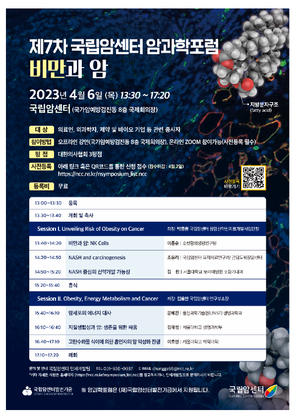 암과학포럼 의장을 맡고 있는 김영우 국립암센터 연구소장은 “현대인에게 꾸준히 증가하고 있는 비만은 여러 면에서 건강에 위험요인으로 작용하므로 이번 포럼을 통해 비만이 암의 발생과 진행에 영향을 미치는 과정을 전문가들과 의료인, 일반 국민들과 공유하고자 한다”라며 “이번 포럼을 계기로 국립암센터는 비만과 관련된 암 연구를 활성화하고, 관련 치료제 개발 및 암 정보 제공에 더욱 힘쓰겠다”라고 덧붙였다.
