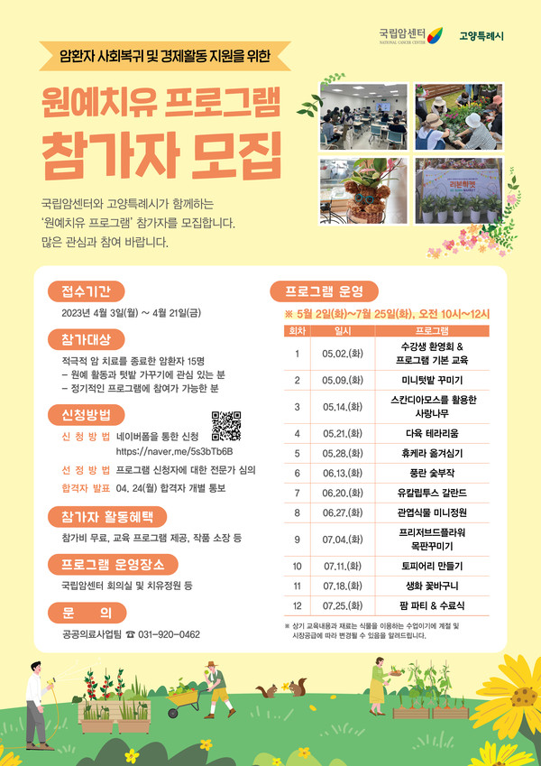 원예치유 프로그램은 5월부터 7월까지 총 12회 과정으로 진행된다. 신청은 네이버폼(http://naver.me/5s3bTb6B) 또는 QR코드를 통해 가능하다. 관련 문의는 국립암센터 공공의료사업팀(031-920-0462)으로 하면 된다.
