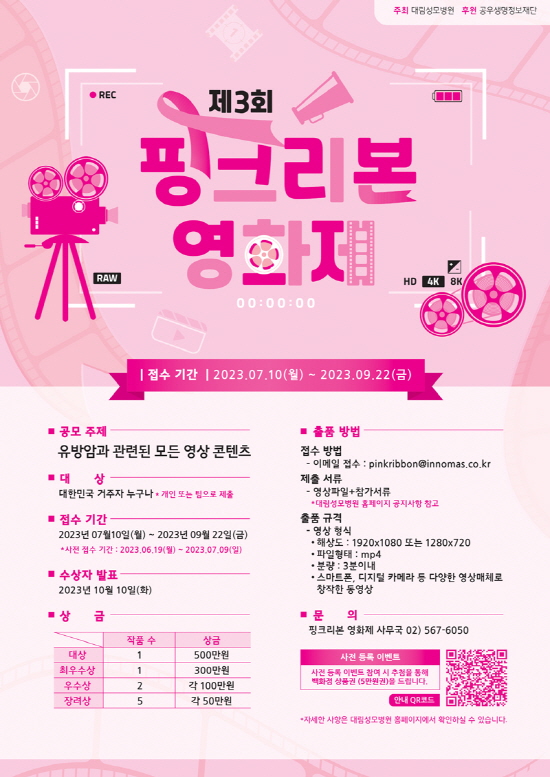 대림성모병원은 유방암을 주제로 하는 제3회 핑크리본 영화제 공모를 시작한다고 26일 밝혔다. 대림성모병원은 해마다 핑크리본 캠페인의 일환으로 유방암 극복 수기 공모전, 유방암 창작시 공모전, 핑크리본 영화제, 유방암 환우를 위한 기금 마련 행사 등의 핑크리본 캠페인을 통해 유방암 인식 개선과 조기 발견의 중요성을 알리는 행사를 진행하고 있다. 올해는 창작시 공모전과 영화제가 개최된다.