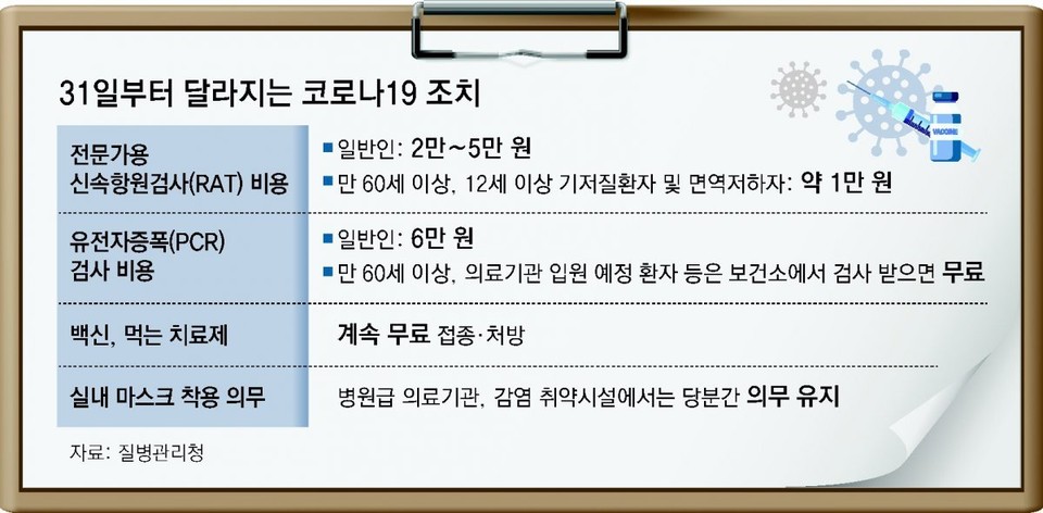 그렇지만 확진자가 된 다음 치료비 지원은 어느 정도 유지된다. 팍스로비드와 라게브리오 등 코로나19 먹는 치료제는 계속 무상으로 지원한다. 내년 상반기로 예정된 ‘완전한 일상 회복’ 이전까지다. 코로나19 중환자의 인공호흡기 등 치료비 일부에 대한 정부 지원은 올해 말까지 유지한다.