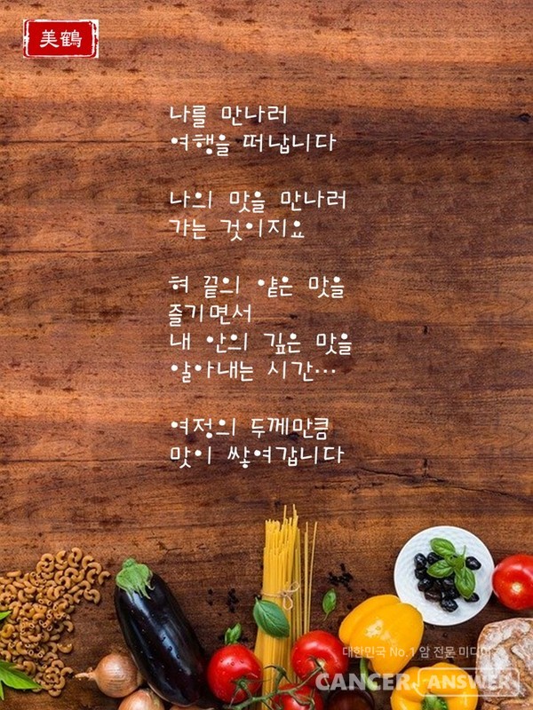 관련기사 연근, 연자, 연잎...버릴 것 하나 없는 연(蓮) 요리의 마법 무와 쪽파로 이런 요리가 어떻게 가능?...항암·항염 효과도 최고 항산화·항암성분 듬뿍... 만들기도 쉬운 브로콜리 요리 '항암채소의 대표주자' 가지와 새싹채소의 콜라보 항암 푸드 시금치·팽이버섯 살짝 데쳐 조물조물…항산화 성분 가득 키워드 #항암식단 #건강레시피 #미역초무침 #건강밥상 #맛있는반찬 #반찬만들기 편집=이보람 기자 ram4886@daum.net 다른기사 보기 저작권자 © 캔서앤서(cancer answer) 무단전재 및 재배포 금지 당신만 안 본 뉴스 흰머리가 암과 싸운 흔적이라고? 도쿄대 연구팀 "암세포 방어 메커니즘과 관련" 고 백성문 변호사가 투병했던 부비동암은 어떤 암? 매일 40분씩 빨리 걷기...췌장암ㆍ대장암 위험 17% 감소 '렉라자+리브리반트' 병용요법, 비소세포폐암 최우선 치료옵션 인정 내가 지냈던 암요양병원, 절망 속에서 삶을 다시 배우게 해준 학교였다 내 어릴 적 트라우마... 생애 첫 겨울잠바의 기억 암은 축복의 이름으로 찾아온 선물이었습니다 흰머리가 암과 싸운 흔적이라고? 도쿄대 연구팀 "암세포 방어 메커니즘과 관련" 댓글삭제 삭제한 댓글은 다시 복구할 수 없습니다. 그래도 삭제하시겠습니까? 비밀번호 닫기 기사 댓글 0 댓글 접기 로그인 후 이용 가능합니다. 댓글 내용입력 비회원 로그인 이름 비밀번호 댓글 내용입력 댓글쓰기 계정을 선택하시면 로그인·계정인증을 통해 댓글을 남기실 수 있습니다. 회원 로그인 비회원 글쓰기 이름 비밀번호 자동등록방지 로그인 옵션 창닫기 주요기사 암치료 중 많이 하는 질문 (1) 손발저림 어떻게 해결하나요? 만성골수성백혈병, 항암제 치료 효과 예측 가능 가을의 발 뒤꿈치 겨울이 보네 최근 주목받는 유방암 치료제 버제니오·티루캡은 어떤 약? 혈액검사 호중구 수치 해석하는 법...이럴 땐 즉시 응급실 가야 암, 인생 후반전의 꿈을 열어준 고마운 존재