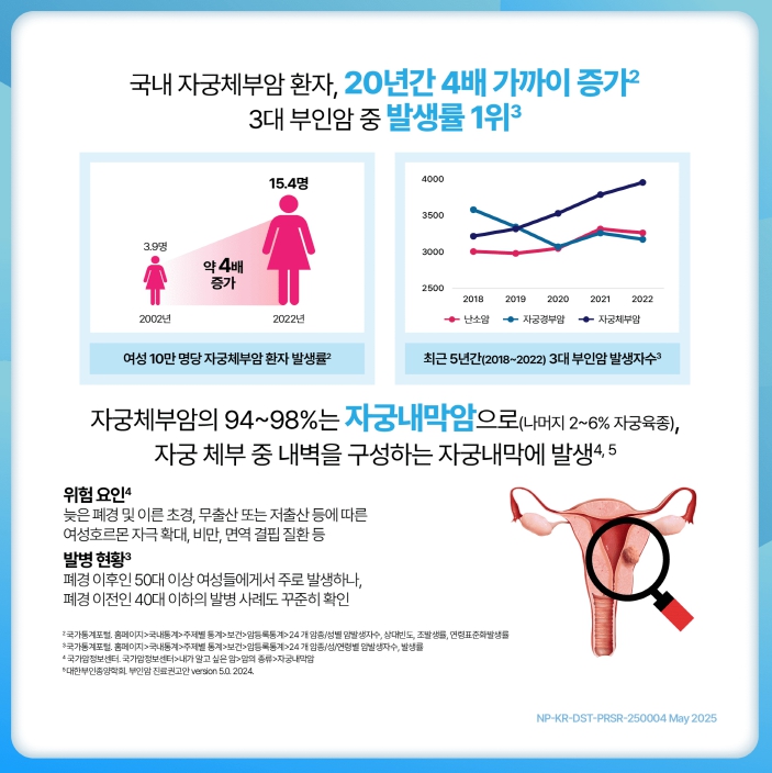 자궁체부암 발병률은 2002년 여성 10만 명당 3.9명에서 2022년 15.4명으로 20년 사이 약 4배로 증가했으며, 특히 2020년대 들어서는 3대 부인암 중 매년 가장 많은 발생자수를 보이고 있다.