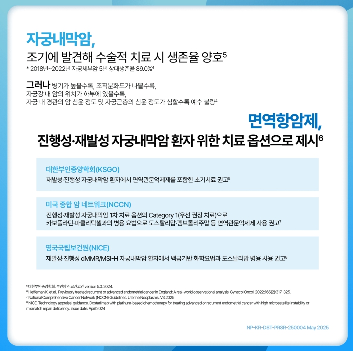 이런 가운데 등장한 면역항암제가 진행성·재발성 자궁내막암 환자들의 생존율을 개선할 수 있는 치료 옵션으로 제시되고 있다. 그 중 GSK의 PD-1 저해제 젬퍼리(성분명 도스탈리맙)는 2024년 12월 새로 진단된 진행성·재발성 자궁내막암이 있는 성인 환자에서 카보플라틴 및 파클리탁셀과의 병용요법으로 적응증을 승인받았다. 불일치 복구결함(dMMR) 여부와 관계없이 진행성·재발성 자궁내막암 1차 치료에서 젬퍼리를 사용할 수 있게 된 것이다.