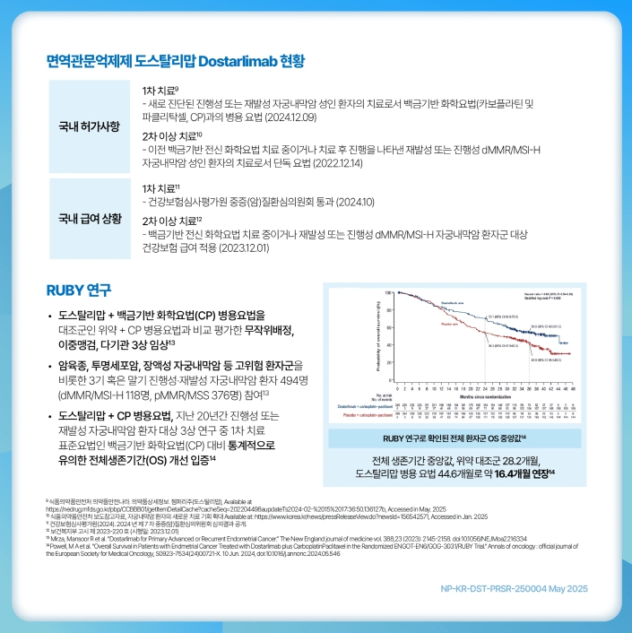 이듬해인 2024년 3월에는 백금기반 화학요법(CP)과의 병용요법으로 진행성 또는 재발성 dMMR/MSI-H 자궁내막암 성인 환자의 치료제로 승인됐으며, 같은 해 12월 MMRp/MSS 종양이 있는 환자의 1차 치료를 대상으로도 적응증을 추가 승인받아 자궁내막암 1·2차 치료 모두에서 허가 받은 면역항암제가 됐다.