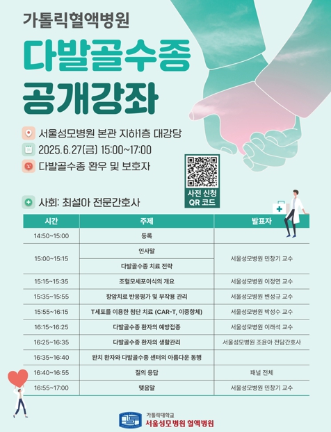 가톨릭대학교 서울성모병원은 6월27일(금) 오후 3시 본관 지하 1층 대강당에서 ‘다발골수종 공개강좌’를 개최한다. 이 강좌는 서울성모병원 혈액병원 다발골수종센터가 주관하며, 다발골수종 환우와 보호자를 대상으로 진행된다.
