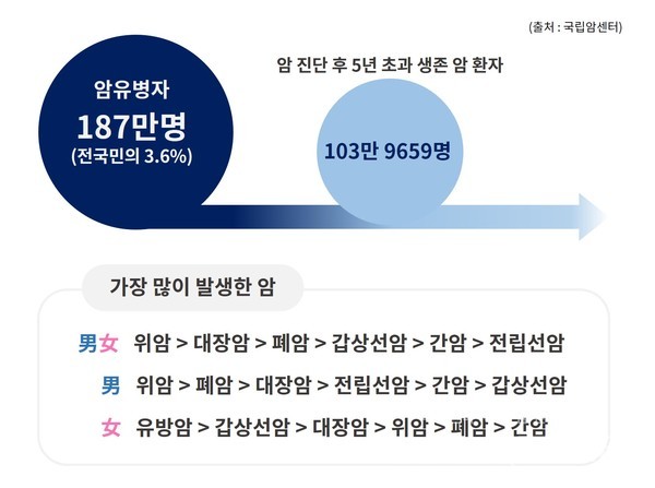 현재 우리나라에서 암 확진 후 치료 중이거나 완치된 암유병자 수는 약 187만명으로 우리나라 전체 국민의 3.6%를 차지한다. 암등록 통계는 1999년에 시작됐고 2018년 1월 1일 현재 생존자 기준이다.