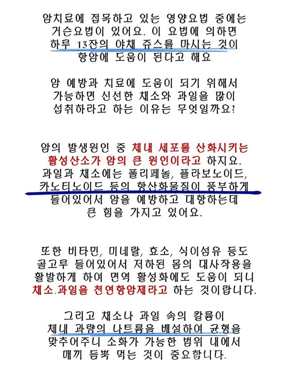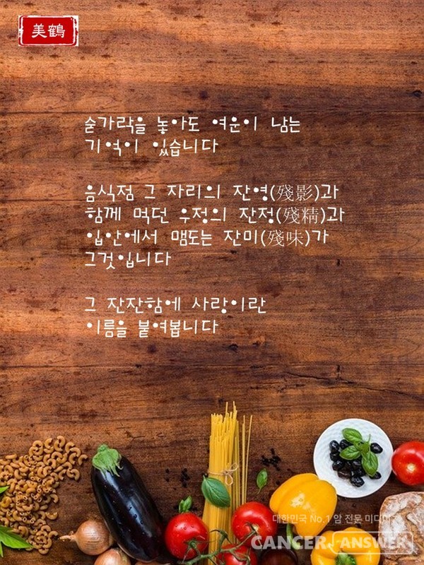관련기사 군침 도는 마늘반찬 '통마늘 옆 마늘종 무침' '송송부추 깍두기오이 무침' - 사과,오이로 만든 깍두기는 어떤 맛? '건강엔 최고' 미역과 양파...둘을 합친 맛은 어떨까? 연근, 연자, 연잎...버릴 것 하나 없는 연(蓮) 요리의 마법 항산화·항암성분 듬뿍... 만들기도 쉬운 브로콜리 요리 '항암채소의 대표주자' 가지와 새싹채소의 콜라보 항암 푸드 시금치·팽이버섯 살짝 데쳐 조물조물…항산화 성분 가득 키워드 #항암식단 #건강식단 #반찬레시피 #미학부부 #항암밥상 편집=이보람 기자 ram4886@daum.net 다른기사 보기 저작권자 © 캔서앤서(cancer answer) 무단전재 및 재배포 금지 당신만 안 본 뉴스 흰머리가 암과 싸운 흔적이라고? 도쿄대 연구팀 "암세포 방어 메커니즘과 관련" 고 백성문 변호사가 투병했던 부비동암은 어떤 암? 매일 40분씩 빨리 걷기...췌장암ㆍ대장암 위험 17% 감소 '렉라자+리브리반트' 병용요법, 비소세포폐암 최우선 치료옵션 인정 내가 지냈던 암요양병원, 절망 속에서 삶을 다시 배우게 해준 학교였다 내 어릴 적 트라우마... 생애 첫 겨울잠바의 기억 암은 축복의 이름으로 찾아온 선물이었습니다 흰머리가 암과 싸운 흔적이라고? 도쿄대 연구팀 "암세포 방어 메커니즘과 관련" 댓글삭제 삭제한 댓글은 다시 복구할 수 없습니다. 그래도 삭제하시겠습니까? 비밀번호 닫기 기사 댓글 0 댓글 접기 로그인 후 이용 가능합니다. 댓글 내용입력 비회원 로그인 이름 비밀번호 댓글 내용입력 댓글쓰기 계정을 선택하시면 로그인·계정인증을 통해 댓글을 남기실 수 있습니다. 회원 로그인 비회원 글쓰기 이름 비밀번호 자동등록방지 로그인 옵션 창닫기 주요기사 암치료 중 많이 하는 질문 (1) 손발저림 어떻게 해결하나요? 만성골수성백혈병, 항암제 치료 효과 예측 가능 가을의 발 뒤꿈치 겨울이 보네 최근 주목받는 유방암 치료제 버제니오·티루캡은 어떤 약? 혈액검사 호중구 수치 해석하는 법...이럴 땐 즉시 응급실 가야 암, 인생 후반전의 꿈을 열어준 고마운 존재