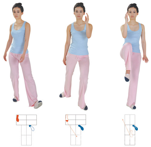 ➂ 오른 발을 앞으로 끌어오다가 무릎을 굽히면서 들어올린다. 발끝은 밑으로 늘어뜨린다. 동시에 오른손을 곧게 세워 손끝을 눈썹 높이로 들어올려 팔꿈치와 오른쪽 무릎이 서로 마주보게 한다. 손바닥은 왼 쪽을 향한다. 동시에 왼 손은 손바닥이 아래를 향하게 돌리면서 왼 쪽 고관절 옆으로 내린다