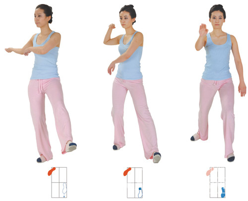 ③ 중심을 왼 발로 옮기며 발끝을 내려딛는 동시에 오른 손은 손바닥을 세우면서 허리를 따라 앞으로 밀어나간다. 손목은 어깨높이다. 동시에 왼 손은 사타구니를 보호하며 왼쪽 무릎을 쓸듯이 지나 넓적다리 옆으로 오게 한다.
