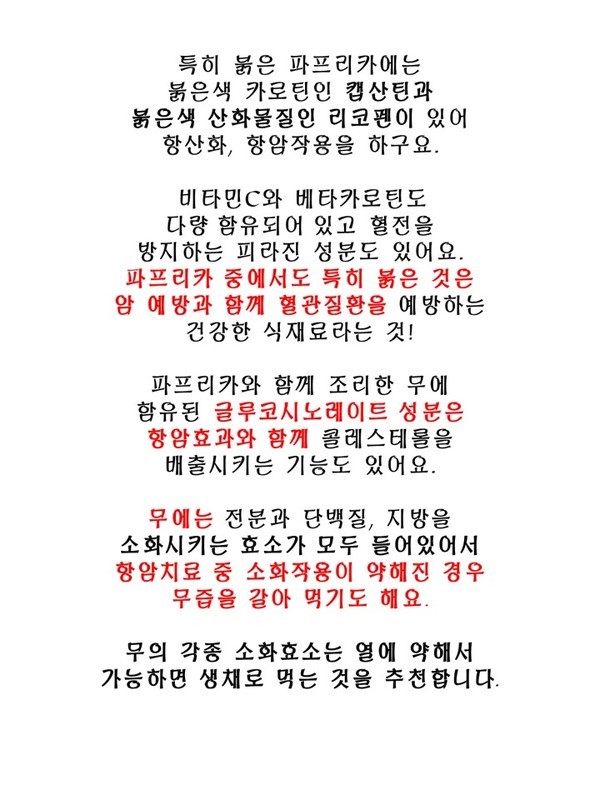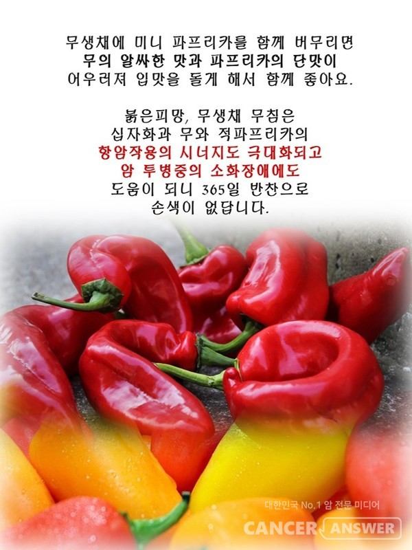 관련기사 비타민D·식이섬유 풍부한 목이버섯, 항종양 효과 높이는 요리 '항암채소의 대표주자' 가지와 새싹채소의 콜라보 항암 푸드 시금치·팽이버섯 살짝 데쳐 조물조물…항산화 성분 가득 키워드 #항암밥상 #미학부부 #반찬레시피 #붉은피망 #파프리카 #무생채 #무침요리 #입맛없을때 정리=홍헌표 기자 bowler1@healer-net.co.kr 다른기사 보기 저작권자 © 캔서앤서(cancer answer) 무단전재 및 재배포 금지 당신만 안 본 뉴스 흰머리가 암과 싸운 흔적이라고? 도쿄대 연구팀 "암세포 방어 메커니즘과 관련" 고 백성문 변호사가 투병했던 부비동암은 어떤 암? 매일 40분씩 빨리 걷기...췌장암ㆍ대장암 위험 17% 감소 '렉라자+리브리반트' 병용요법, 비소세포폐암 최우선 치료옵션 인정 내가 지냈던 암요양병원, 절망 속에서 삶을 다시 배우게 해준 학교였다 내 어릴 적 트라우마... 생애 첫 겨울잠바의 기억 암은 축복의 이름으로 찾아온 선물이었습니다 흰머리가 암과 싸운 흔적이라고? 도쿄대 연구팀 "암세포 방어 메커니즘과 관련" 댓글삭제 삭제한 댓글은 다시 복구할 수 없습니다. 그래도 삭제하시겠습니까? 비밀번호 닫기 기사 댓글 0 댓글 접기 로그인 후 이용 가능합니다. 댓글 내용입력 비회원 로그인 이름 비밀번호 댓글 내용입력 댓글쓰기 계정을 선택하시면 로그인·계정인증을 통해 댓글을 남기실 수 있습니다. 회원 로그인 비회원 글쓰기 이름 비밀번호 자동등록방지 로그인 옵션 창닫기 주요기사 암치료 중 많이 하는 질문 (1) 손발저림 어떻게 해결하나요? 만성골수성백혈병, 항암제 치료 효과 예측 가능 가을의 발 뒤꿈치 겨울이 보네 최근 주목받는 유방암 치료제 버제니오·티루캡은 어떤 약? 혈액검사 호중구 수치 해석하는 법...이럴 땐 즉시 응급실 가야 암, 인생 후반전의 꿈을 열어준 고마운 존재