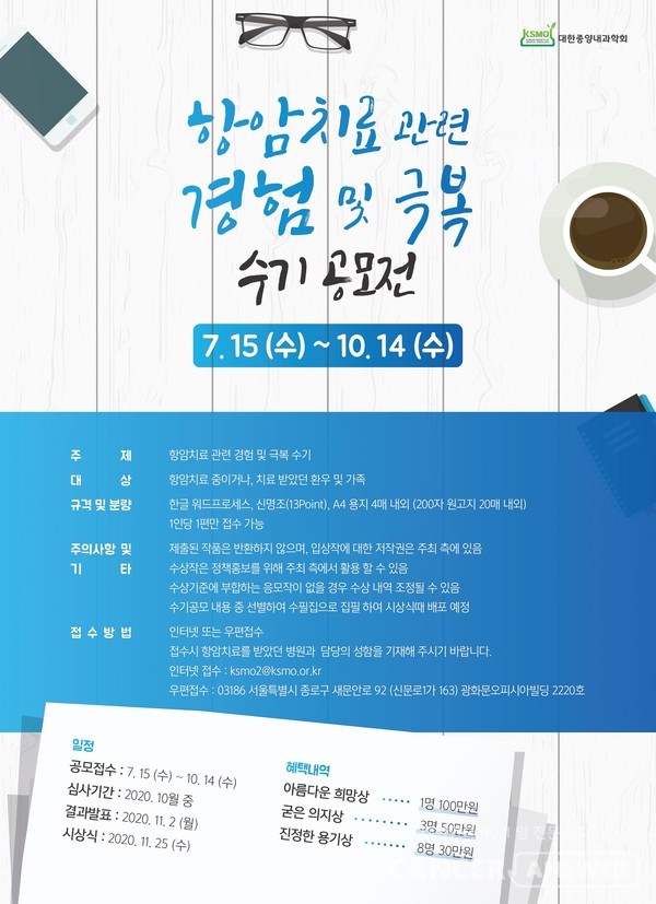 이번 대한종양내과학회 수기 공모전은 이메일(kmso2@ksmo.or.kr) 또는 우편 (서울시 종로구 새문안로 92, 광화문오피시아빌딩 2220호)으로 접수하면 되고 항암치료를 받았던 병원과 담당의 성함을 반드시 기재해야 한다.