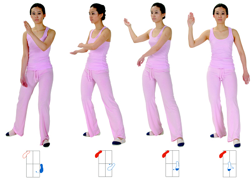 4. 허리를 계속 왼쪽으로 돌리면서 왼손은왼쪽 넓적다리 옆으로 가게 하고, 오른손은 손끝을 눈썹높이로 세워 앞으로 밀어나간다. 동시에 왼발 끝을 안쪽으로 옮겨 딛는다.